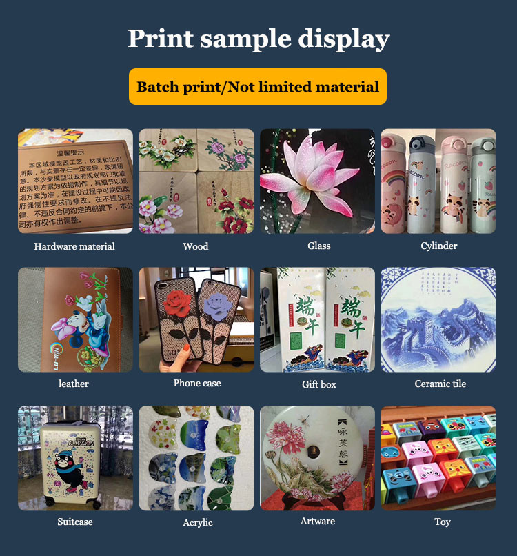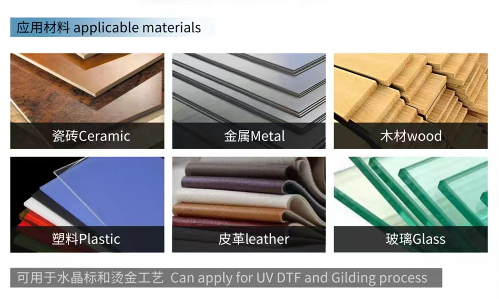 วัสดุการใช้งานการพิมพ์ UV: PVC, ฟิล์มสะท้อนแสง, ผ้าใบ, พรม, หนัง, กระจก, กระเบื้องเซรามิก, โลหะ, เพดาน, อะลูมิเนียม, ไม้, ประตู, แผ่นอะคริลิค, แผ่นลูกแก้ว, แผ่นโฟม, กระดาษลูกฟูก ฯลฯ